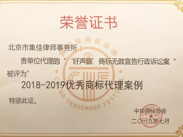 >爱游戏>关于我们>荣誉概览>2019>集佳代理“好声音”商标无效宣告行政案入选“优秀商标代理案例”