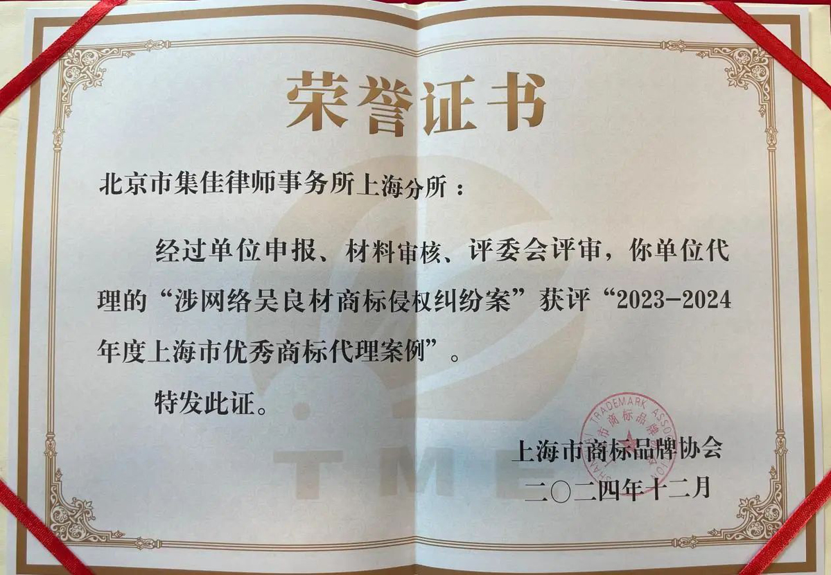 >爱游戏>关于我们>荣誉概览>2025>集佳代理两件案例分别获评2023-2024年度“上海市优秀商标代理案例”及“上海市优秀商标代理案例提名”